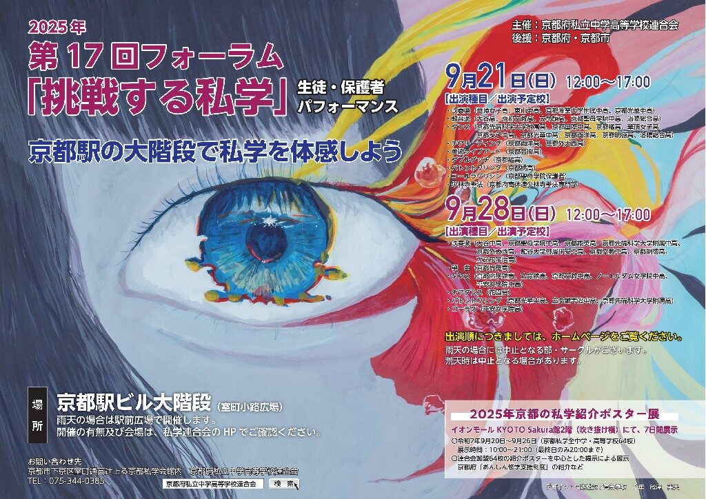 京都の私立中学高等学校の生徒・保護者による公演です。 ※荒天等により、開催の中止、または会場の変更がある場合は、連合会トップページにて お知らせいたします。 来場者が多数の場合は、安全確保のため 観客席への入場を制限させていただくことがございます。 ・雨天時は、駅前広場(京都劇場前)に会場を変更して開催します。 |