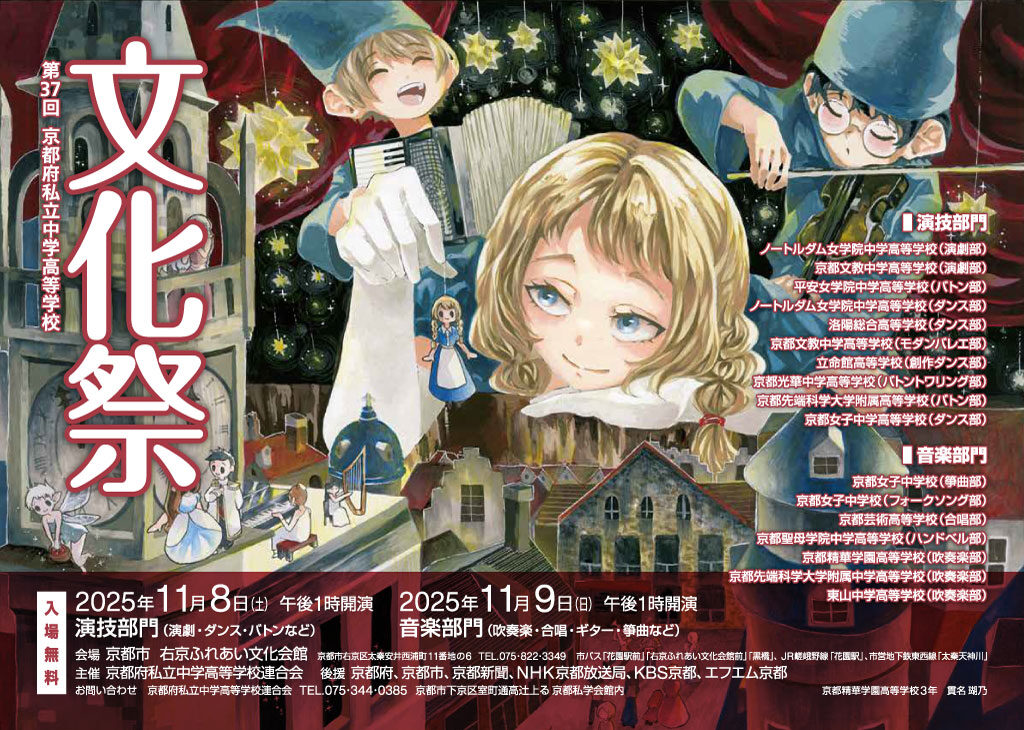 ●京都の私立学校に在学する生徒の演技や演奏の発表会です。 各部門プログラムは、決定次第掲載します。 令和7年11月8日(土)「演技部門」(演劇・ダンス・バトン等) 令和7年11月9日(日)「音楽部門」(吹奏楽・合唱・ギター・筝曲等) |